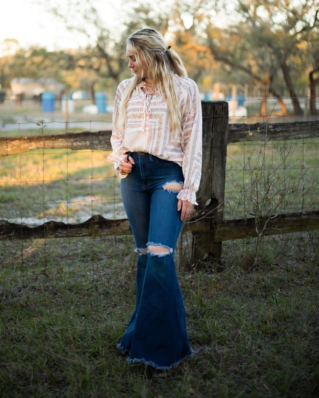 A soft printed blouse tucked into dark flared denim with distressed knees, styled beside a rustic wire fence. The silhouette elongates, and the muted tones feel grounded in nature.