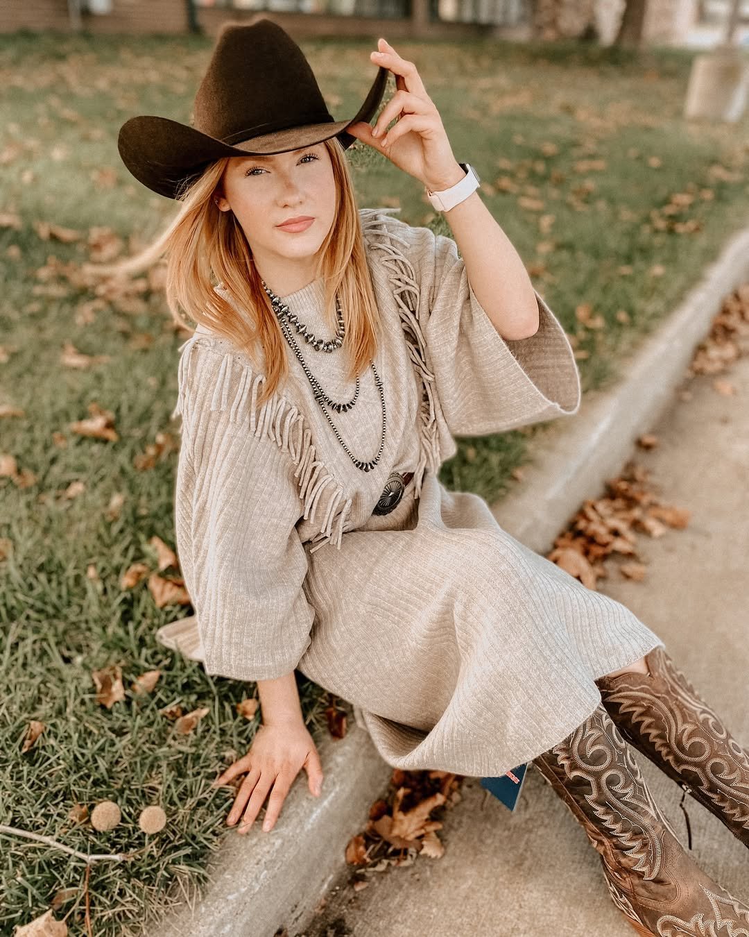 A soft neutral knit dress layered with fringe details and styled with embroidered boots. The black hat sharpens the whole look, adding contrast to the light tones.