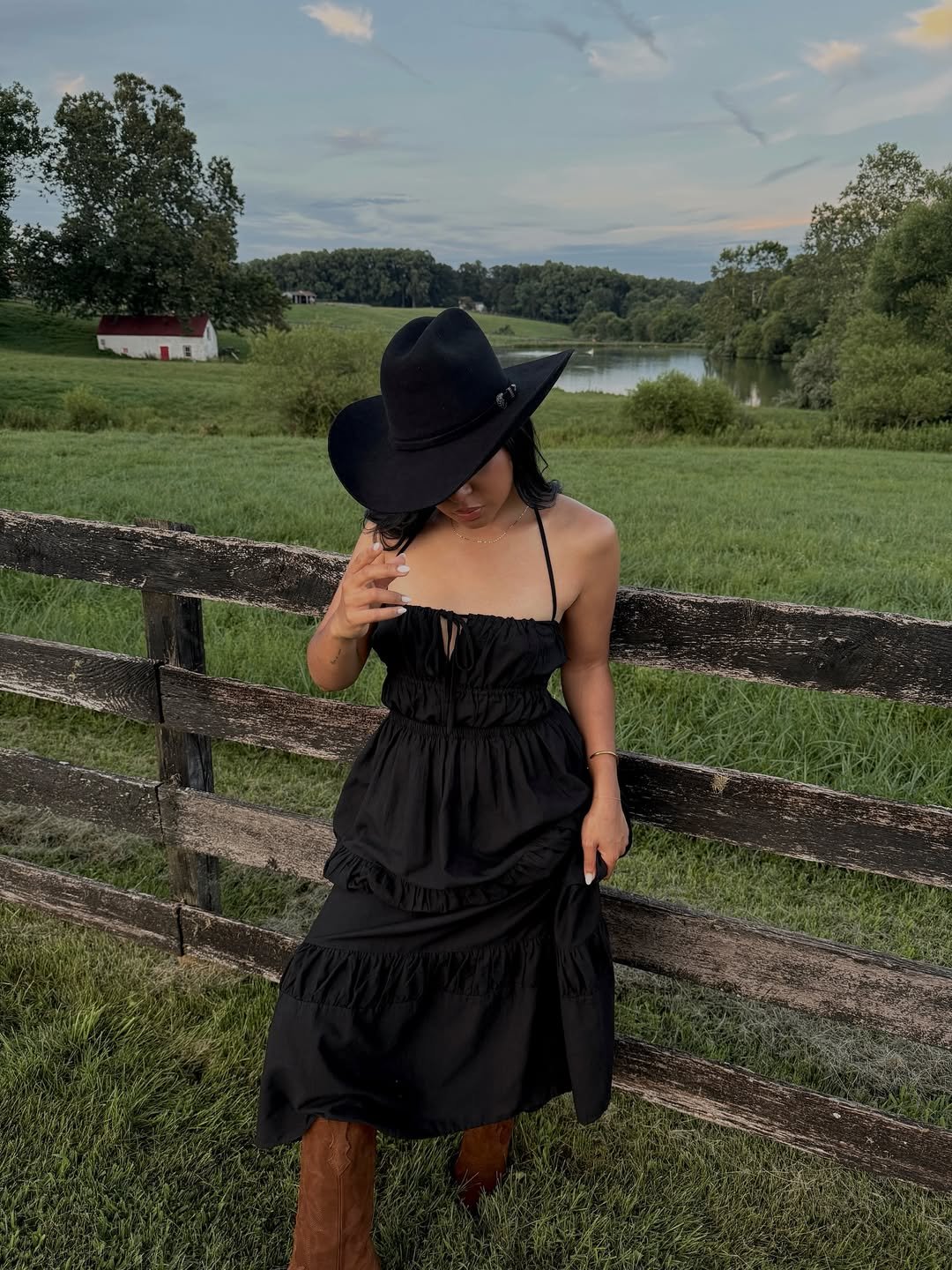 All black with a tiered dress and a wide-brim hat, standing against a wooden fence with open fields behind her. It’s moody, minimal, and quietly powerful.