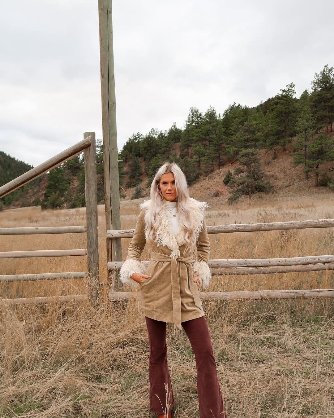 A belted tan coat with fluffy trim, paired with deep brown flares and soft waves flowing in the breeze. Set against open fields and pine-covered hills, it feels cinematic without trying.