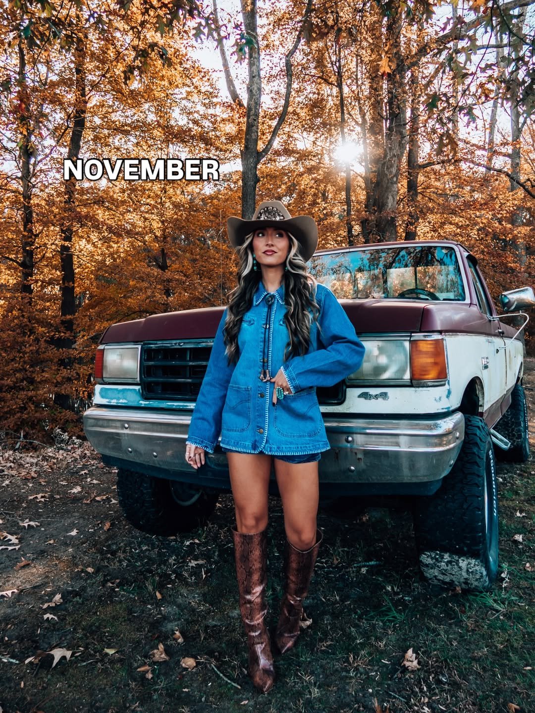 Denim on denim in front of an old truck with amber leaves falling behind her, it doesn’t get more classic than this. The oversized chambray jacket styled as a dress, tall chocolate boots, and that structured cowboy hat feel like a love letter to late fall on the ranch.