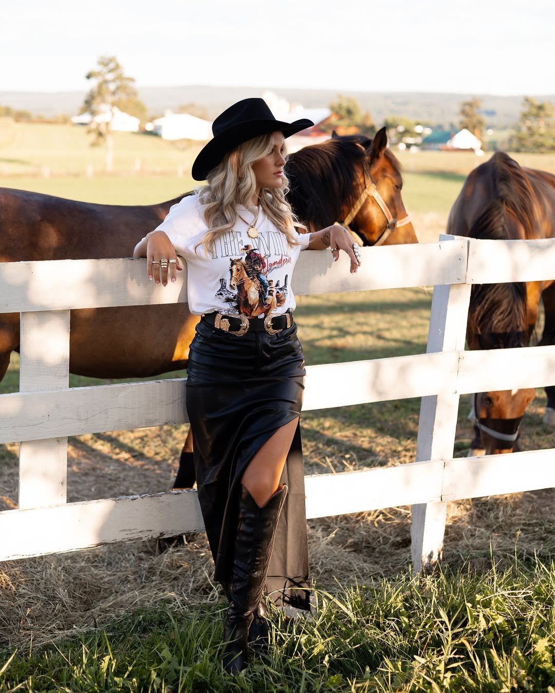 A vintage-inspired cowboy tee tucked into a sleek black leather midi skirt, paired with tall black boots and a structured belt. Styled against a white fence with horses in the background, it balances grit and glam.