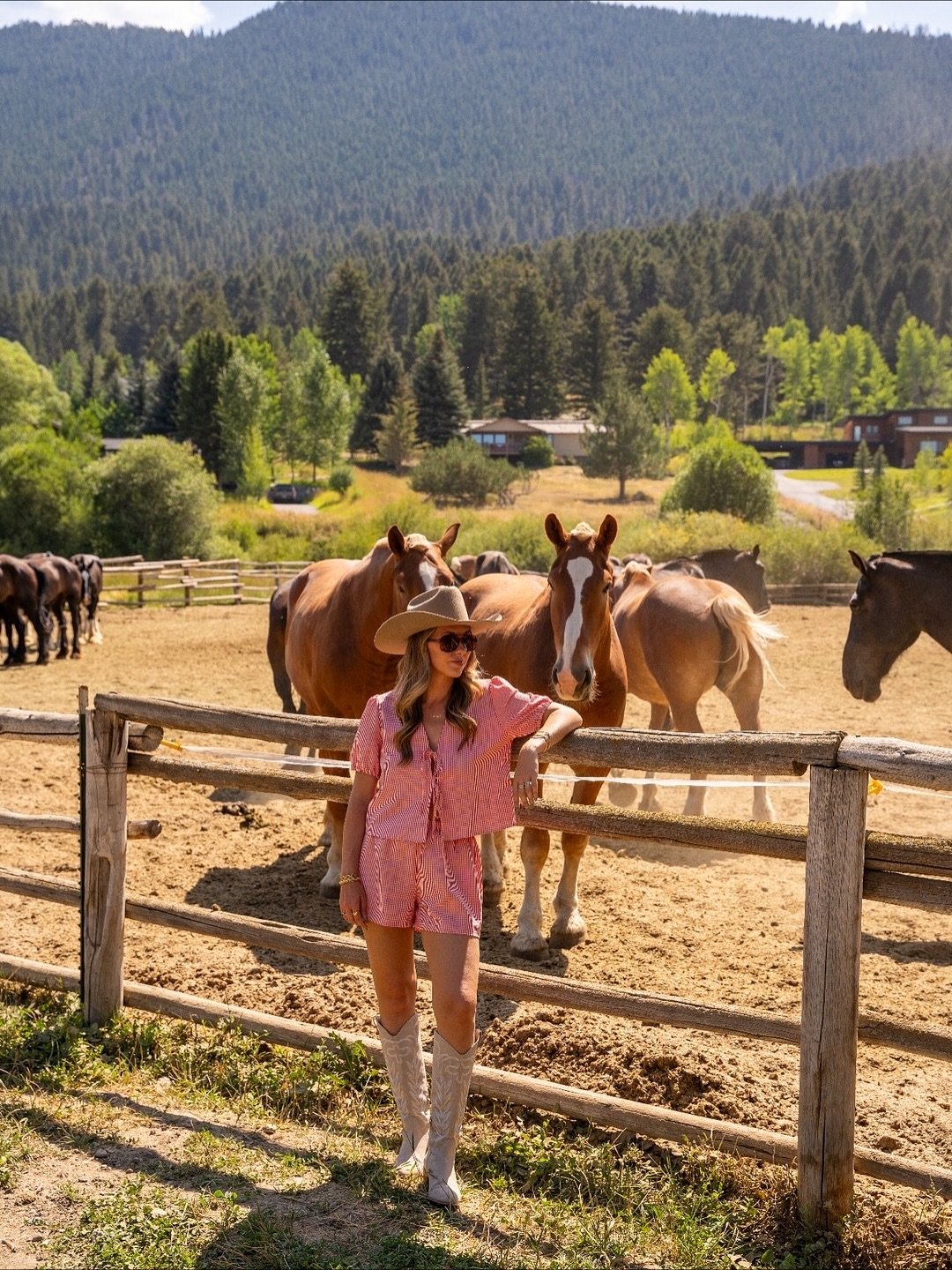 Pink gingham set, cream cowboy boots, and a hat tipped just enough to catch the sun. Leaning against a fence with horses lingering close, it feels relaxed but completely styled. The matching top and shorts keep it cohesive, while the soft boots add that dusty ranch charm.