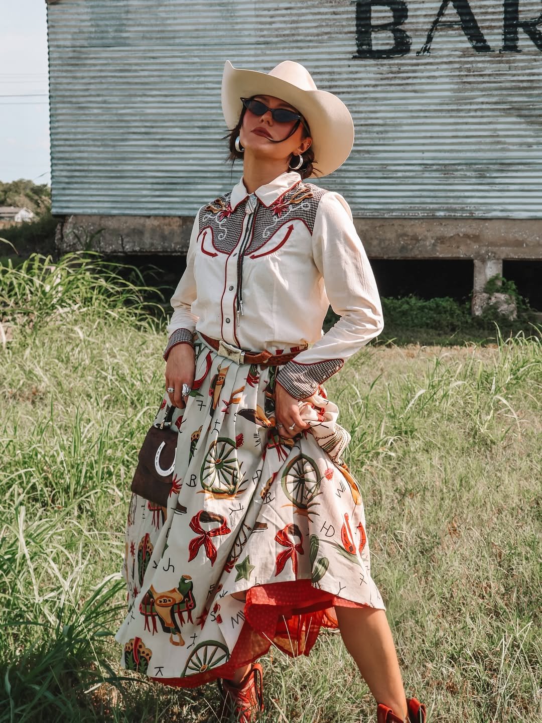 A cream Western shirt with bold red stitching and a full skirt covered in playful rodeo prints. Finished with red boots and a structured hat, it’s unapologetically fun.