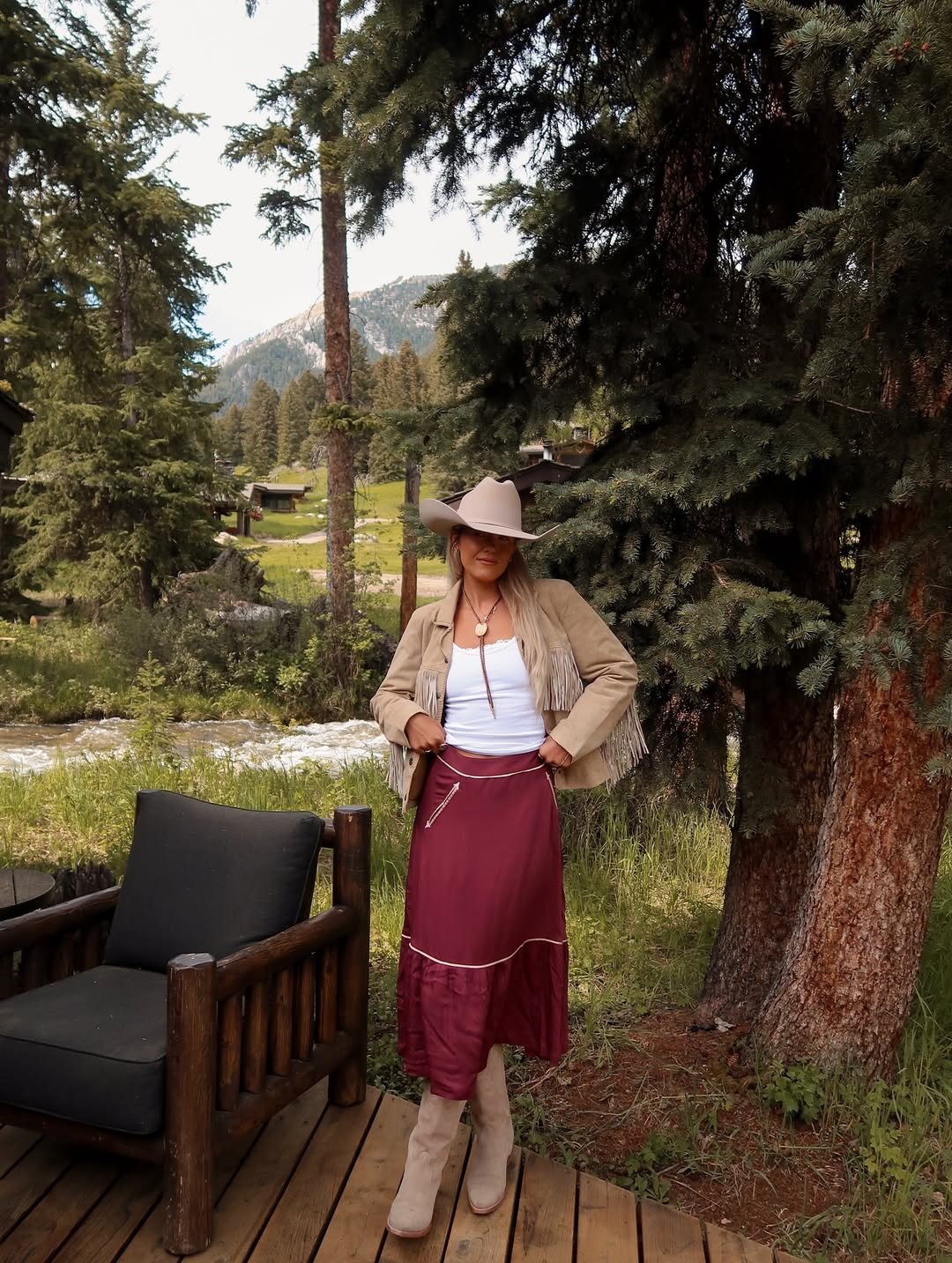 A cream hat, fringed jacket, and a burgundy satin skirt that catches the light by the water. The soft tank underneath keeps it relaxed, while the boots add that ranch-ready edge.