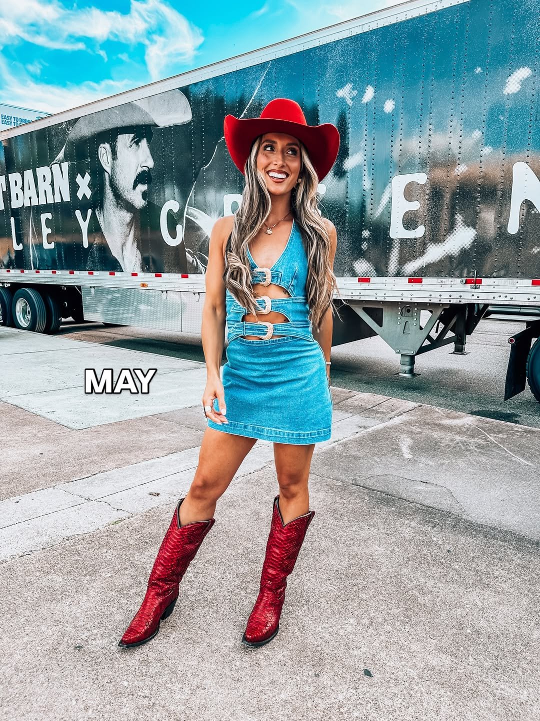 A cutout denim mini with statement buckles, bold red cowboy boots, and a matching hat under a bright sky. This one doesn’t whisper Western, it owns it. The silhouette is flirty, but the accessories bring the grit.