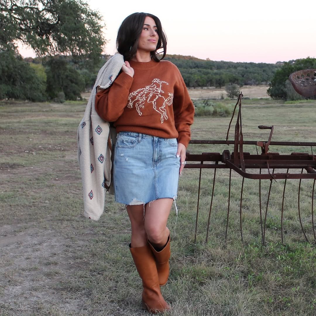 A burnt rust sweater with a bronc rider stitched across the front, paired with a raw-hem denim mini and tall cognac boots. There’s something nostalgic about it, especially set against open land and weathered farm equipment.