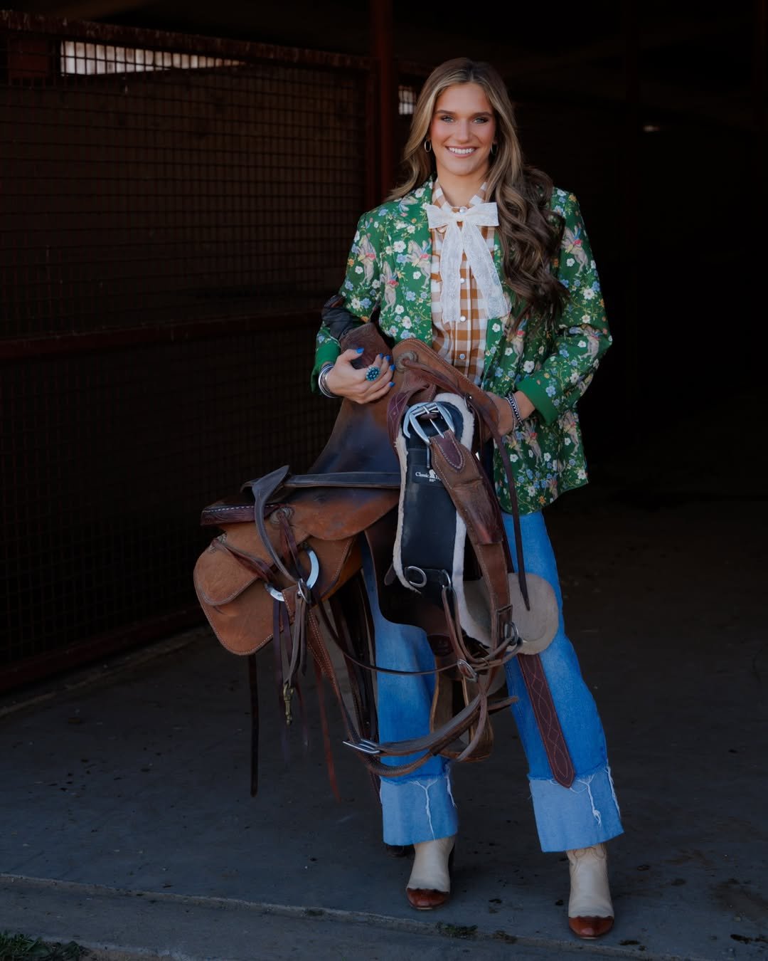 A floral blazer layered over gingham with a bow at the collar, paired with cuffed jeans and cream boots. Holding a saddle like it’s the ultimate accessory, she blends polished and practical in the best way.