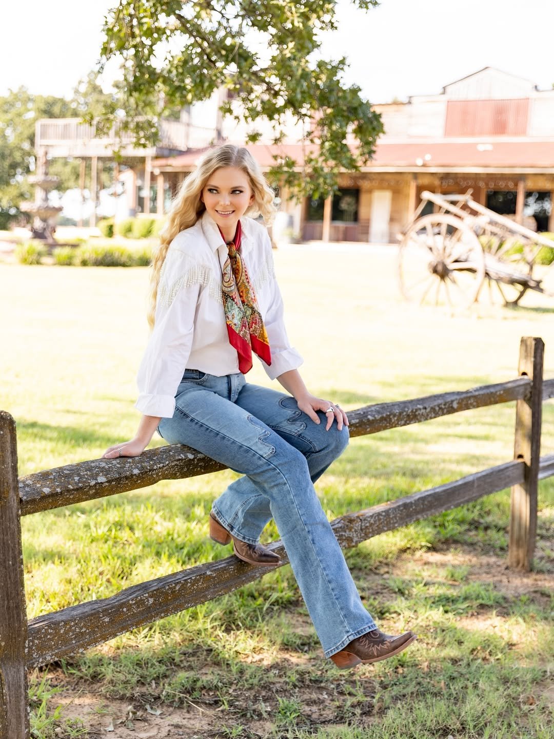 A crisp white blouse, red silk scarf tied at the neck, and straight-leg denim with classic boots. Sitting on a wooden fence with a wagon in the background, it feels timeless.
