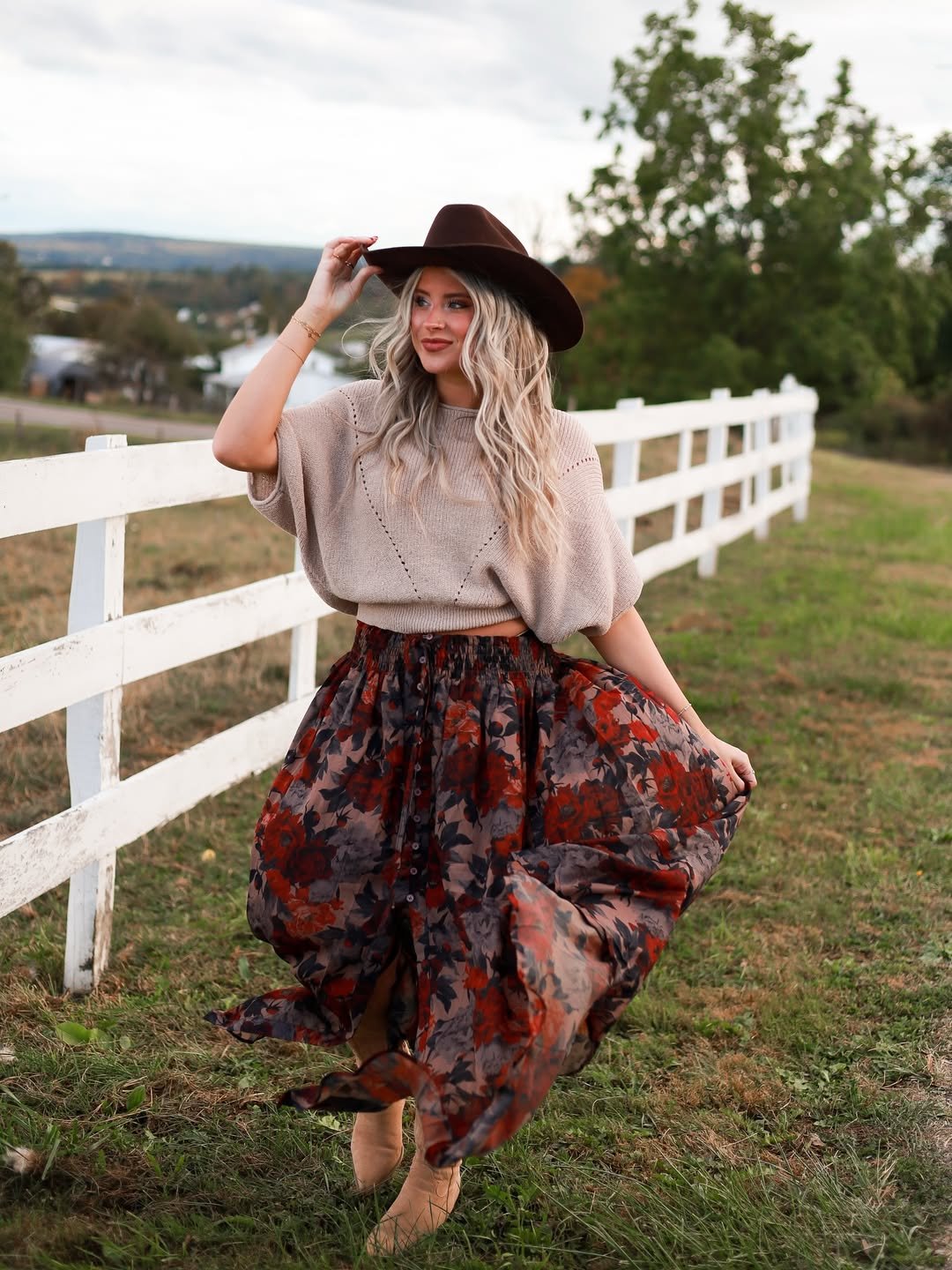 A slouchy knit tucked into a flowing floral skirt, finished with a deep brown hat and soft boots. The movement in the skirt brings romance, while the sweater keeps it wearable.