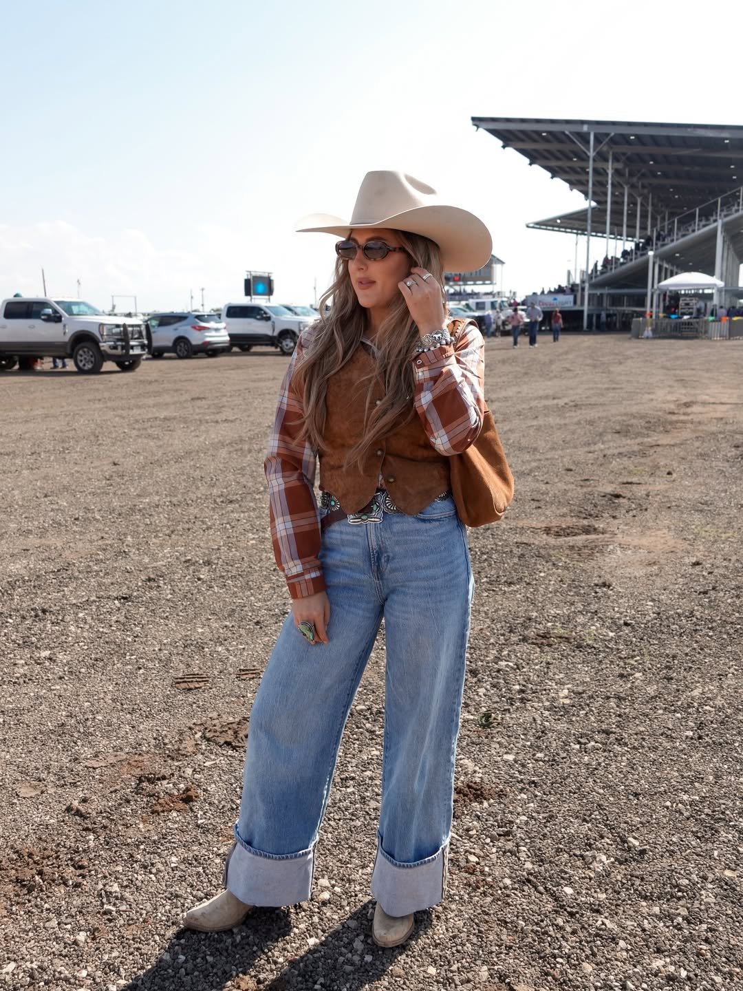 Plaid shirt, suede vest, wide cuffed jeans, and a concho belt that ties it all together. This is heritage Western with a modern silhouette, and those wide legs give it just the right amount of drama.