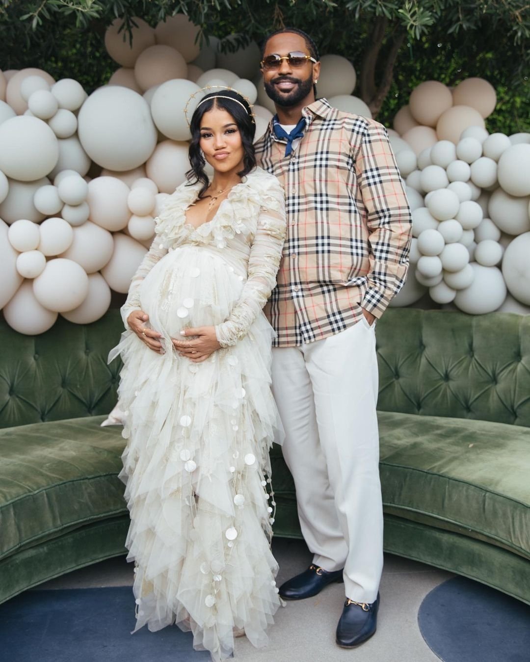 She’s giving goddess energy, but it’s not just for the cameras. This look transforms the typical baby shower dress code into something magical. The pearlescent sequins catch the light just enough to sparkle but never feel garish. It’s opulence, softened by sheer textures and grounded in a palette of creamy neutrals.