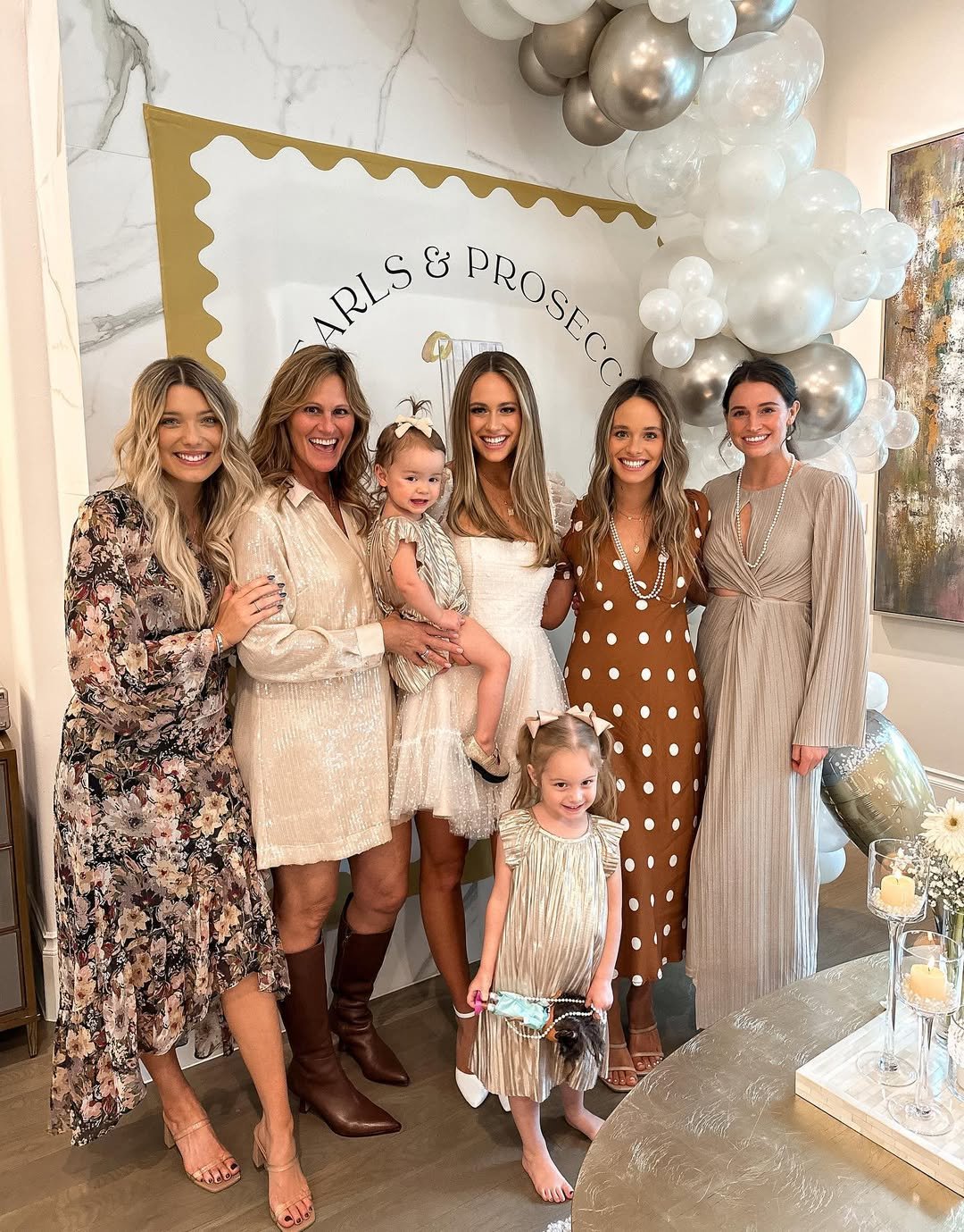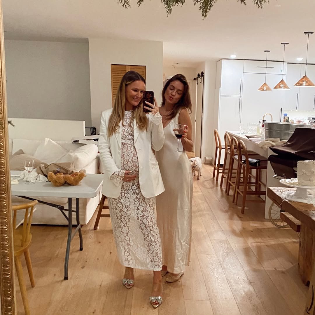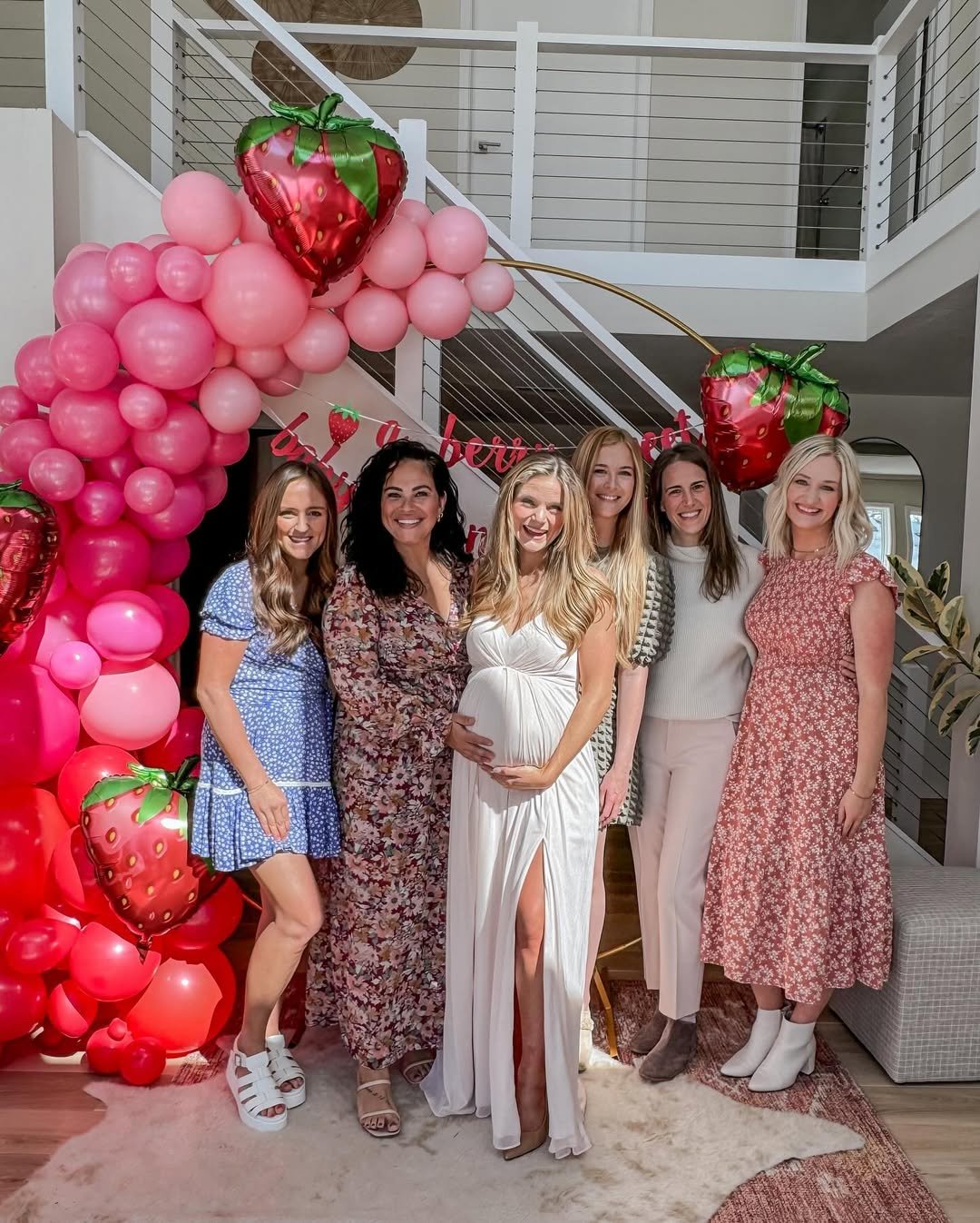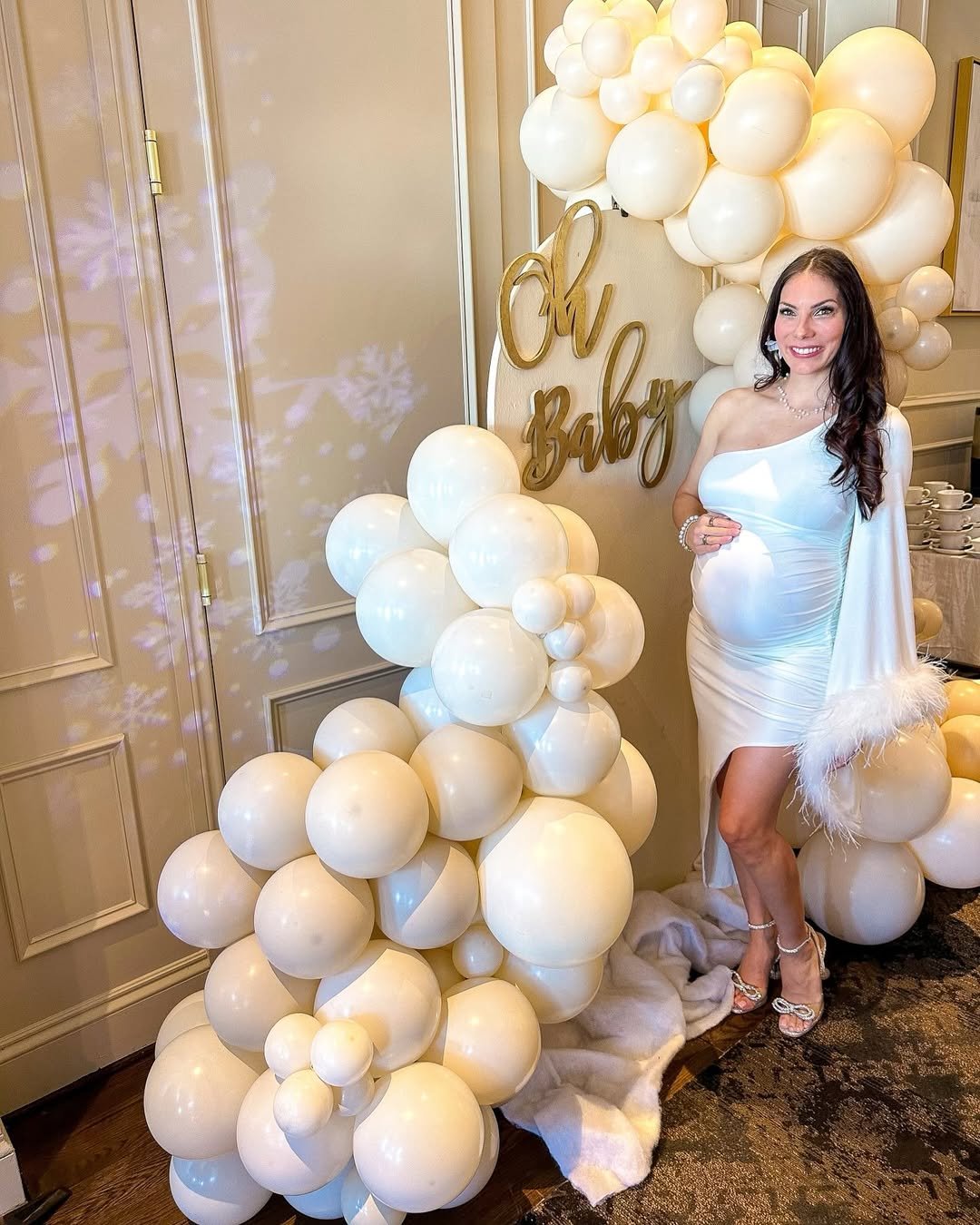 Her bump-hugging dress was playful and chic, with a deep V neckline and flowy skirt that added movement. The backdrop of white and gold balloons made every outfit pop, especially the shimmering neutrals and cozy knits worn by her guests. The whole scene feels like Prosecco and pearls—exactly what the sign behind them promised.