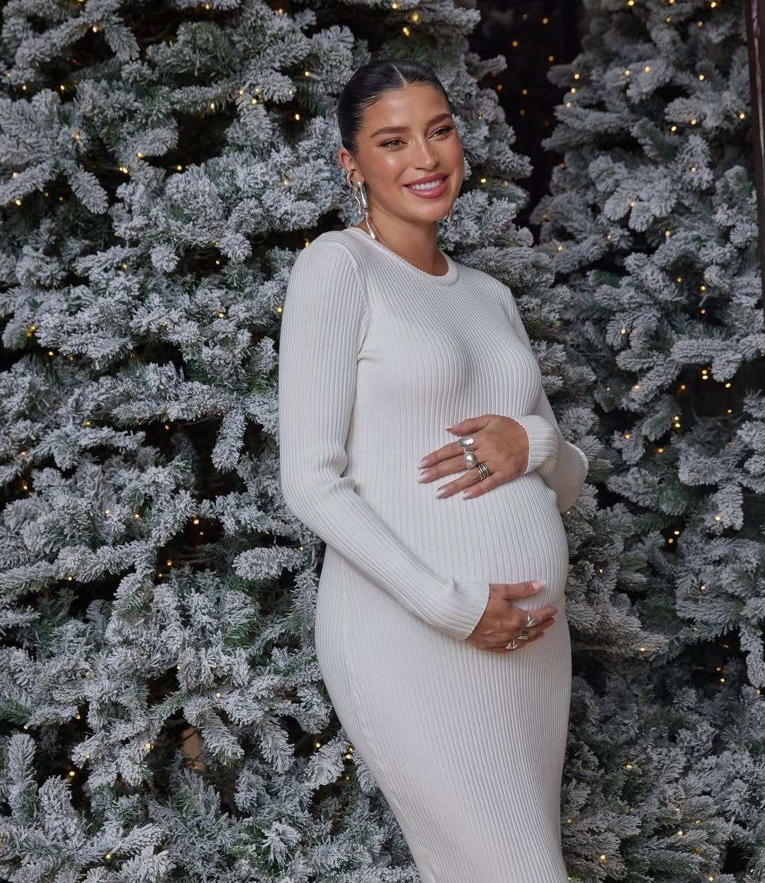Leave it to @justtnic to make ribbed knit look high-fashion. Her long-sleeve, body-hugging ivory sweater dress is a masterclass in cozy luxury. Paired with stacks of rings and bold earrings, the look toes the line between minimal and glam with effortless finesse. It’s giving après-ski chic… but make it baby bump-friendly.