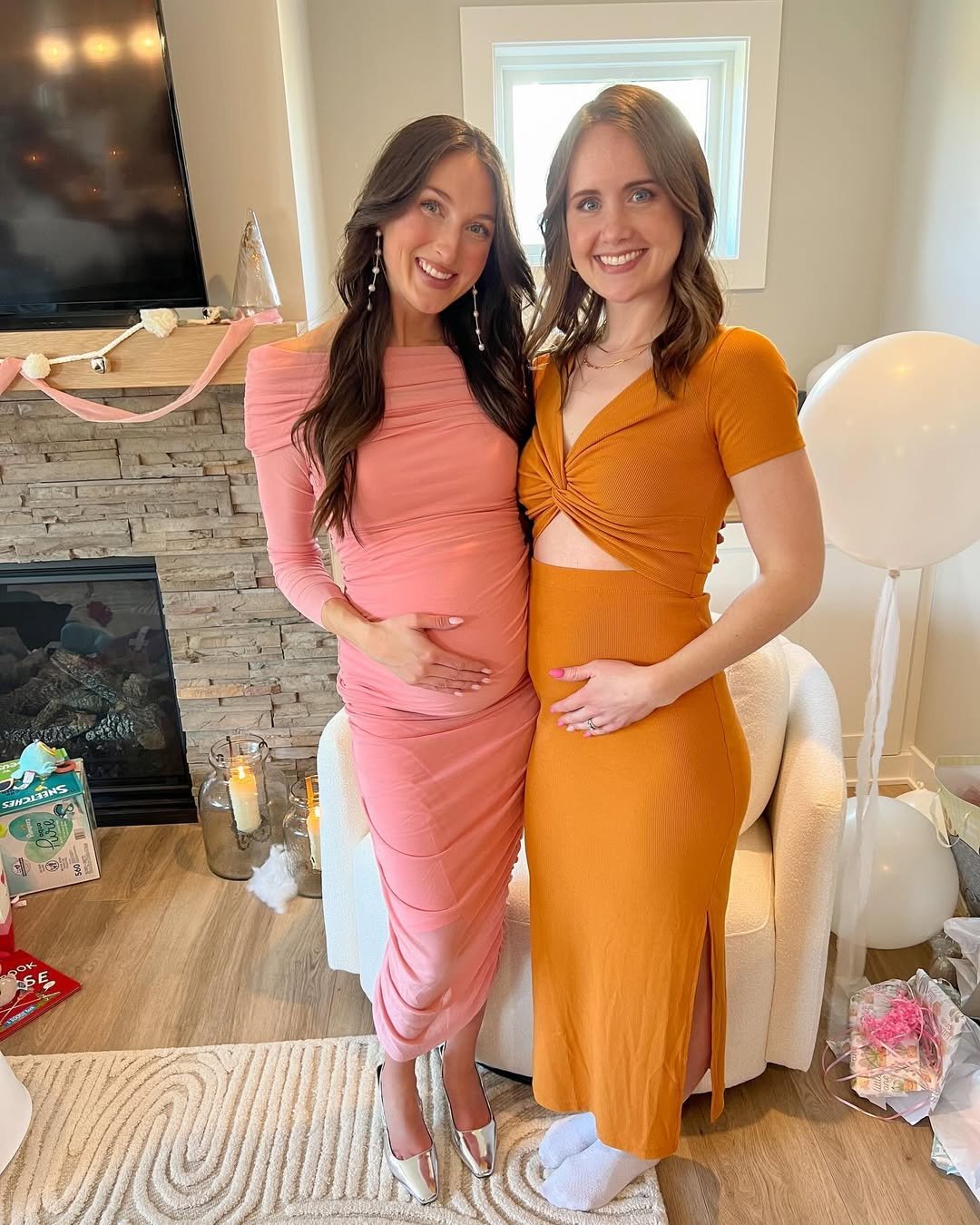 There’s something so effortlessly pretty about a gathered blush midi dress, especially when it’s paired with glowing skin and gleaming metallic pumps. @allieapplegath’s winter baby shower look is feminine without trying too hard—the soft ruching flatters her bump beautifully while the long sleeves and muted tone keep things cozy and seasonally appropriate. Her silver heels add just the right amount of shine, balancing the softness of her dress with a dash of modern edge.