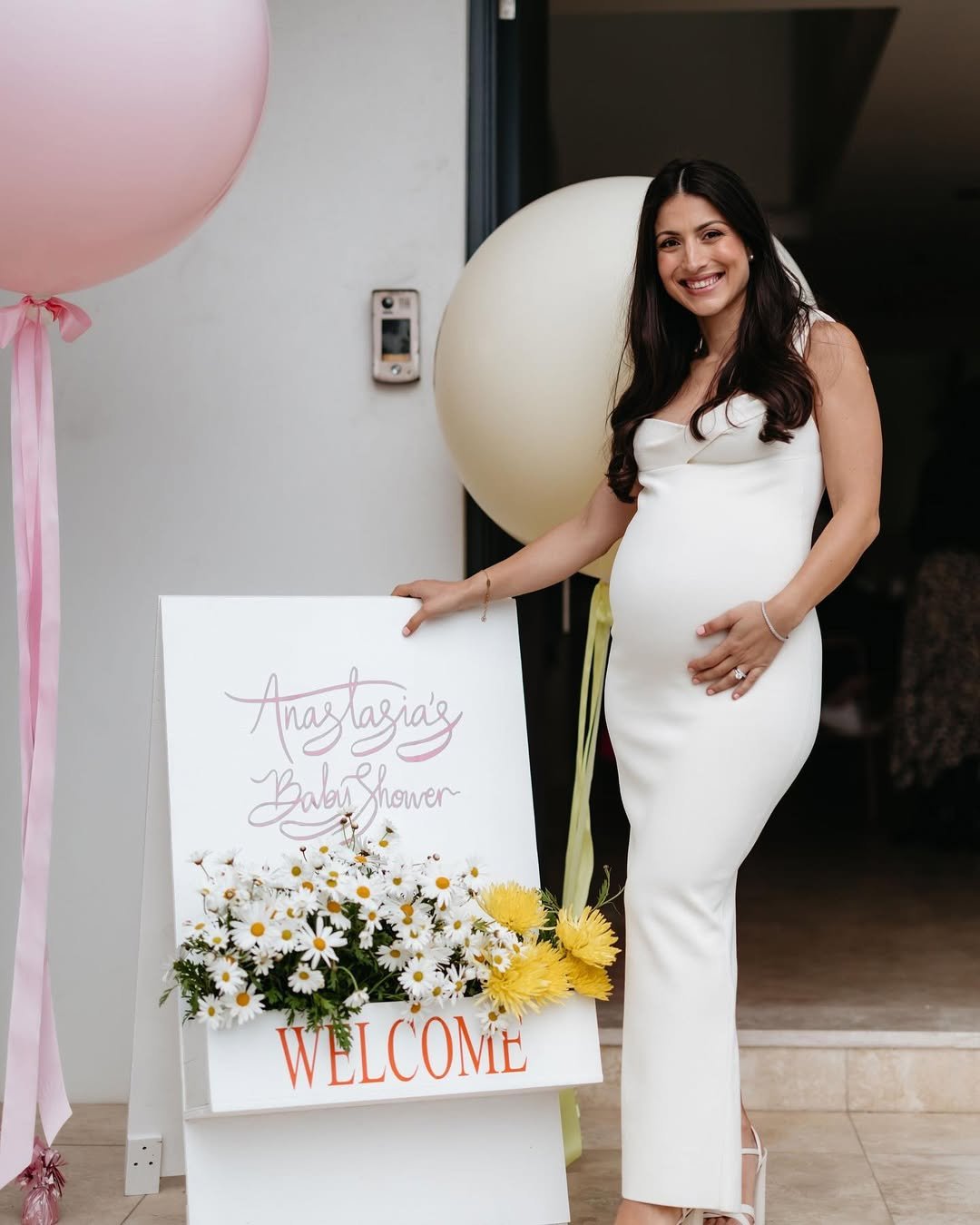 From the strawberry balloon arch to the flowy white slit dress, @itskyajeub’s shower was nothing short of berry sweet. Her look is classic with a twist—strapless and ruched over the bump, with a subtle thigh slit that adds a flirty feel without losing the softness. This is sunshine-in-winter dressing, full of playful spirit.