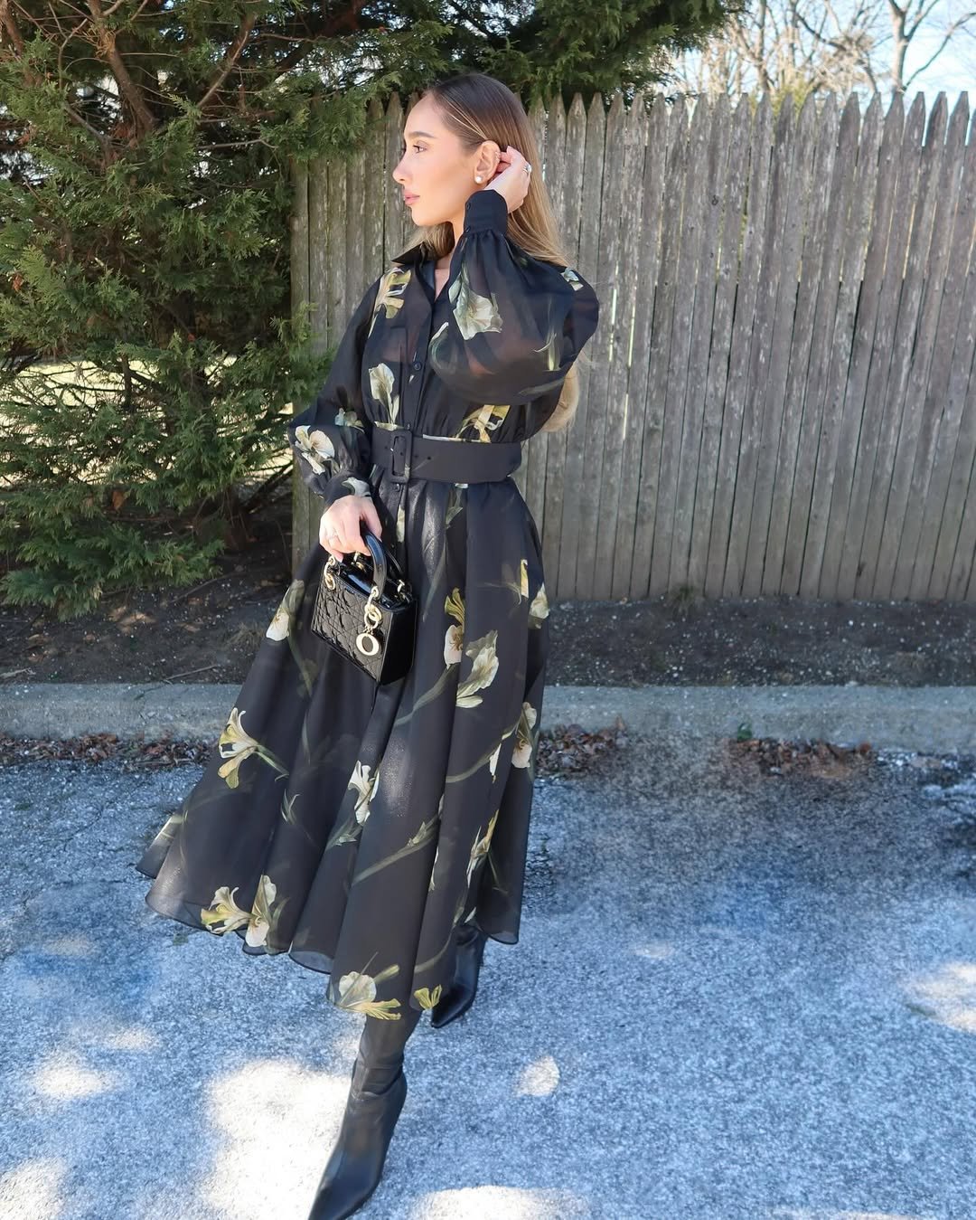 The voluminous sleeves and cinched waist create such a flattering shape, and her choice to style it with all-black accessories—boots, belt, bag—brings a sleek contrast that anchors the ethereal vibe. It’s the kind of look you wear when your baby shower doubles as a style statement. Think garden party meets editorial photoshoot.